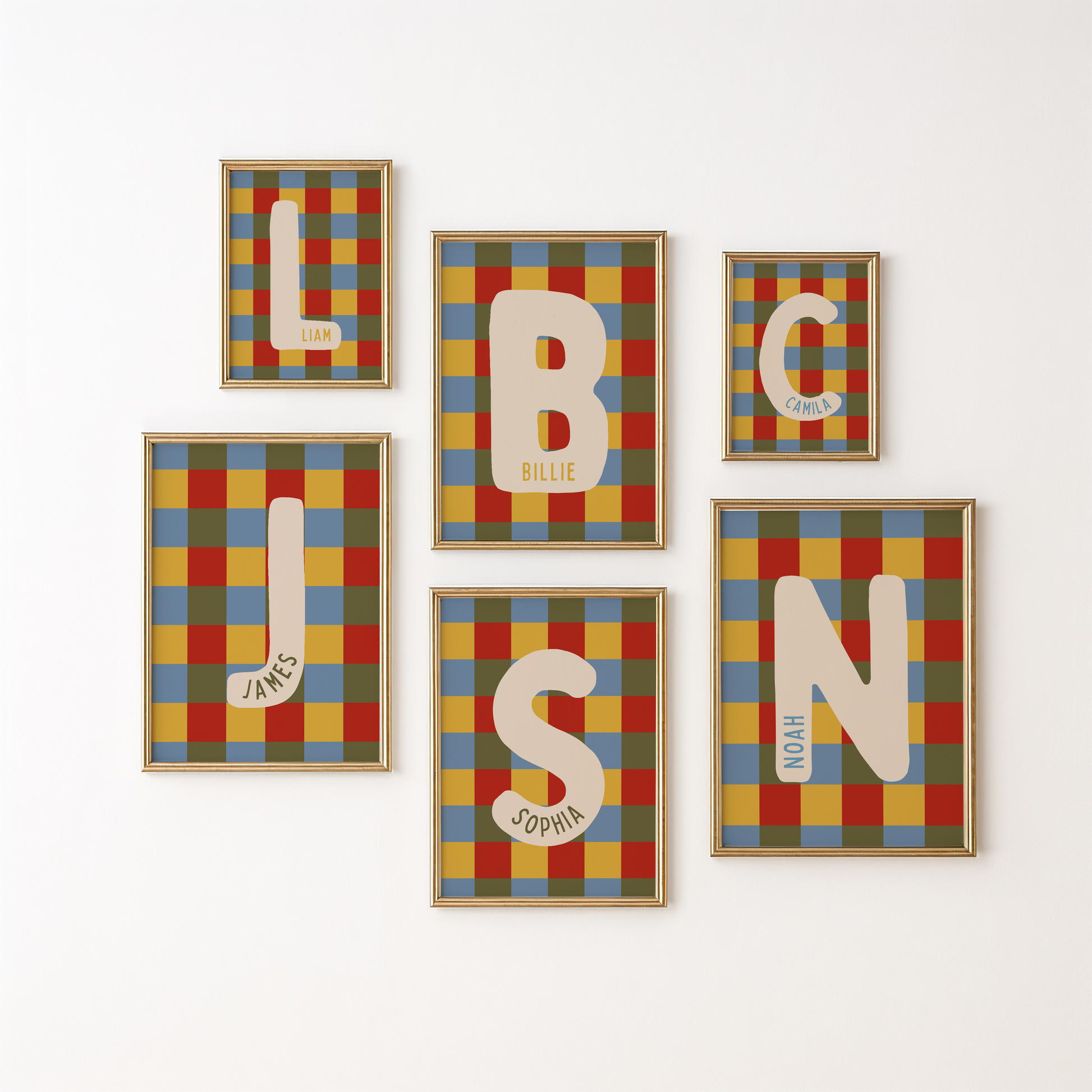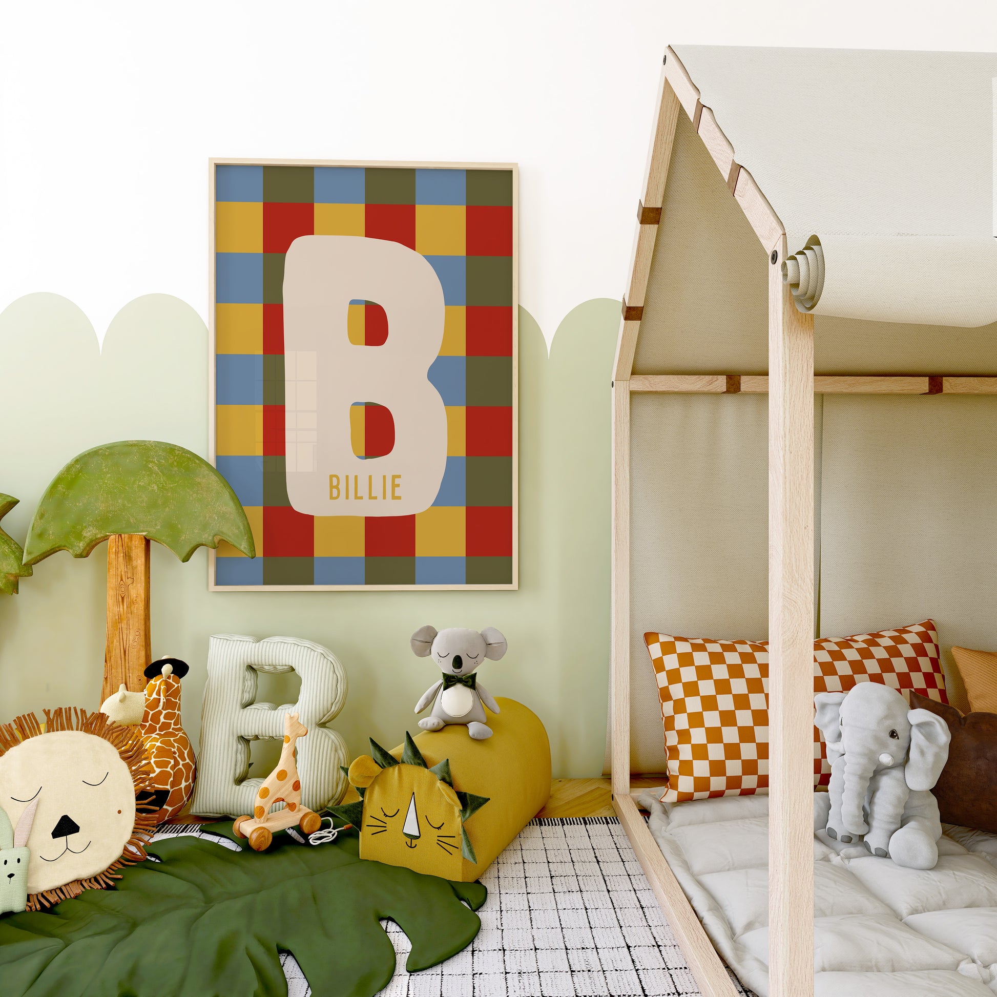 This Custom Initial Name Print with a playful patchwork-inspired checkered background in yellow, green, blue, and red is a playful yet quirky piece of wall art that brings personality to any nursery, kids room, or playroom. It also makes a thoughtful gift for moms who want something whimsical and unique for their little ones.