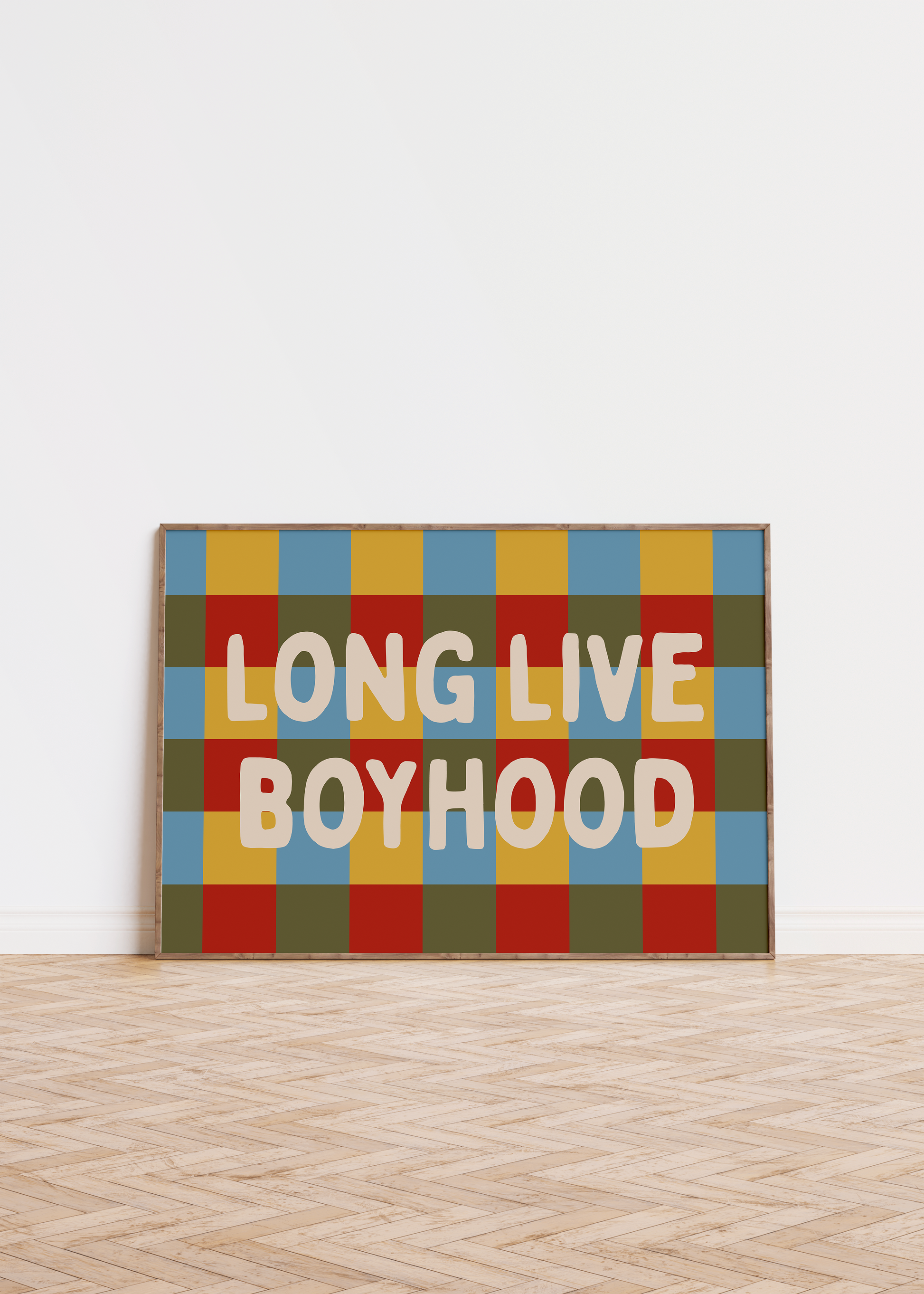 Celebrate the magic of growing up with our Long Live Boyhood print — an original design created by us. Set against a colorful checkered background in a fun horizontal layout, this vibrant wall art adds bold personality to any boys’ nursery, kids' room, or playroom. Download and print at home in minutes, or send it to your local print shop.