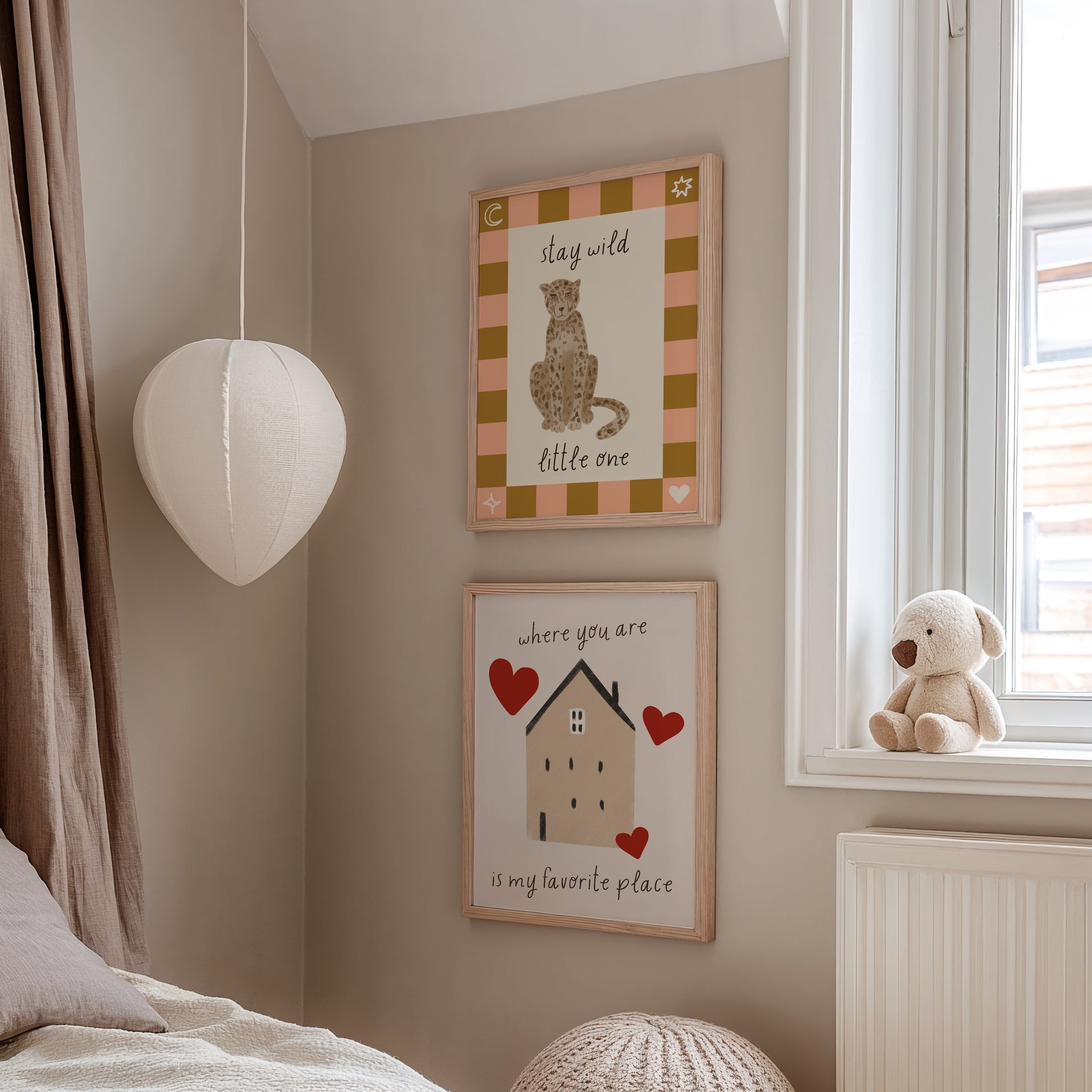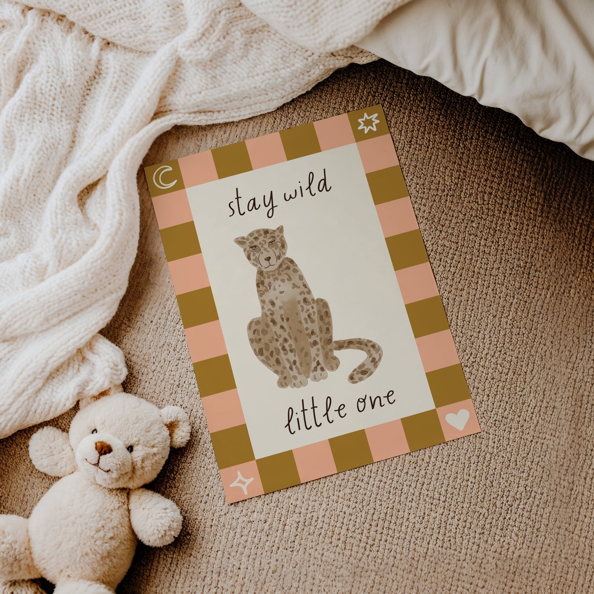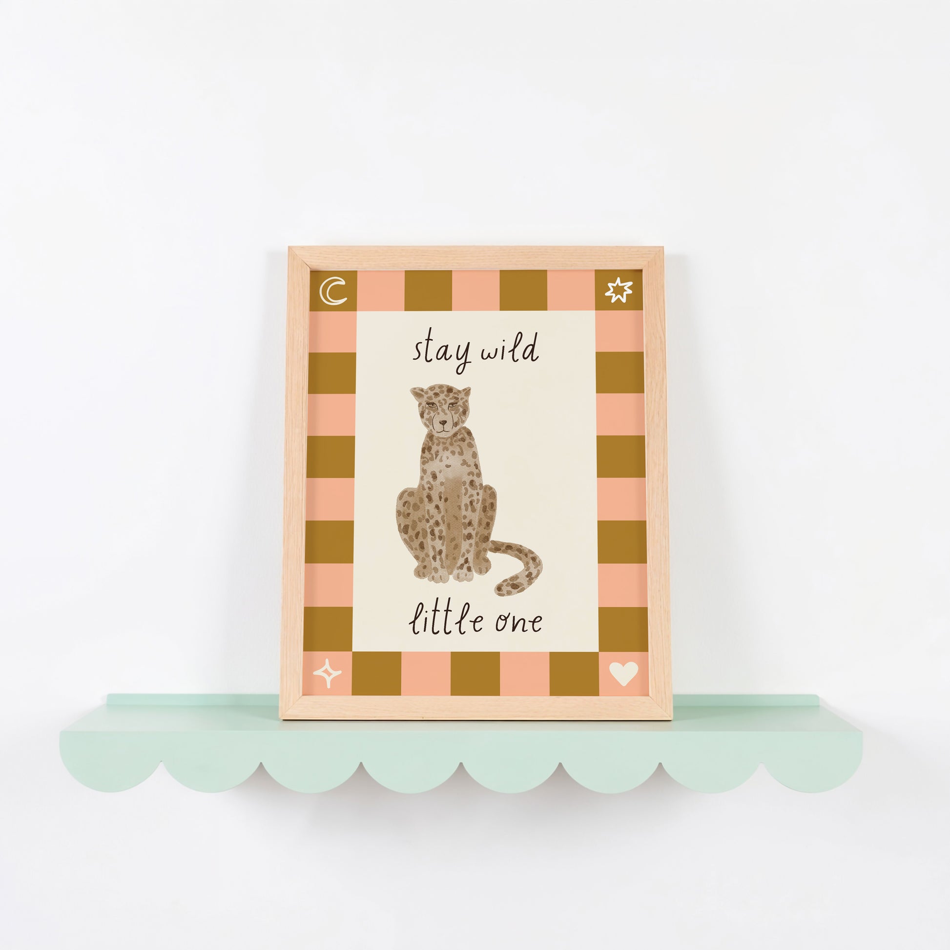 Add a playful touch to your little one's nursery with our 'Stay Wild Little One' print, an original design created by us. Featuring a cheerful cheetah illustration and a safari animal theme, this whimsical artwork is perfect for inspiring adventure and curiosity. With its peach coral and yellow mustard checkered border, it's the perfect addition to any girls' room. Download and print at home in minutes, or send it to your local print shop.
